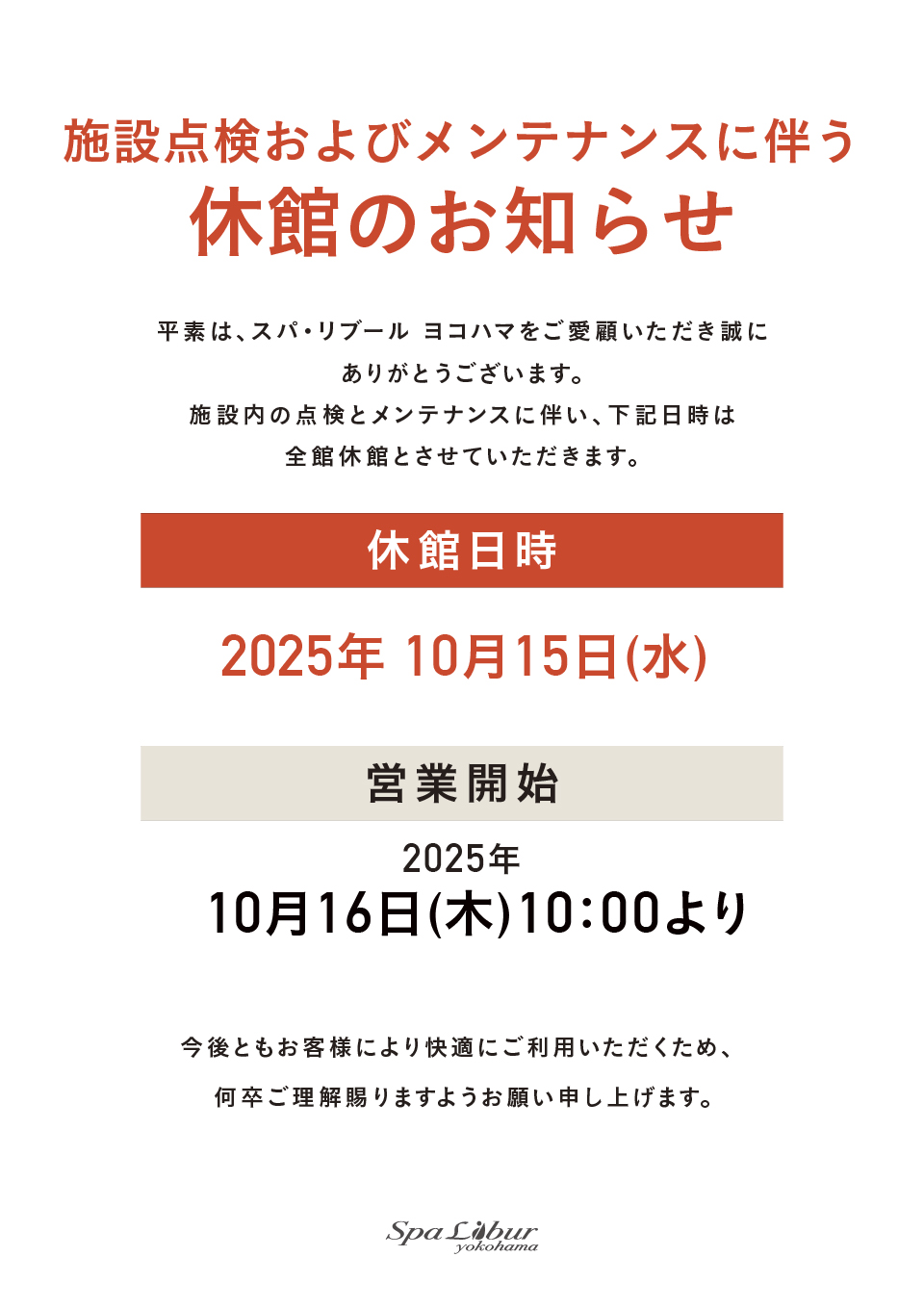 平素は、スパ・リブール ヨコハマをご愛顧いただき誠に
